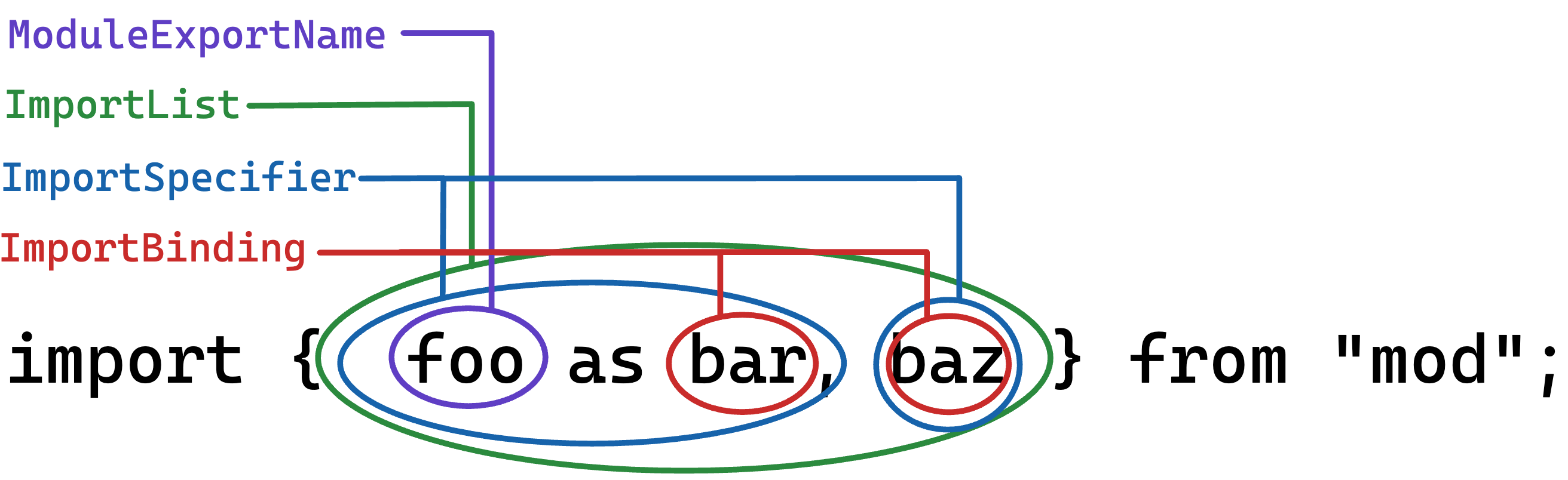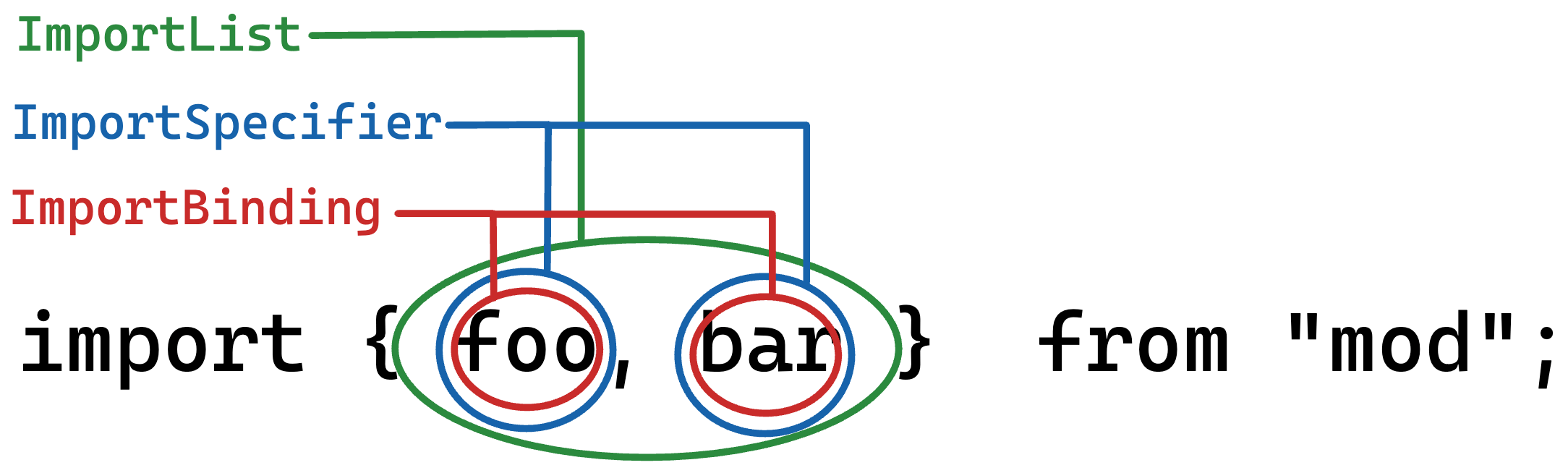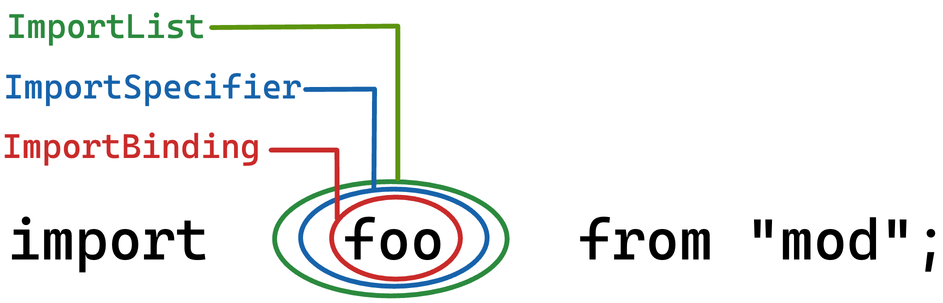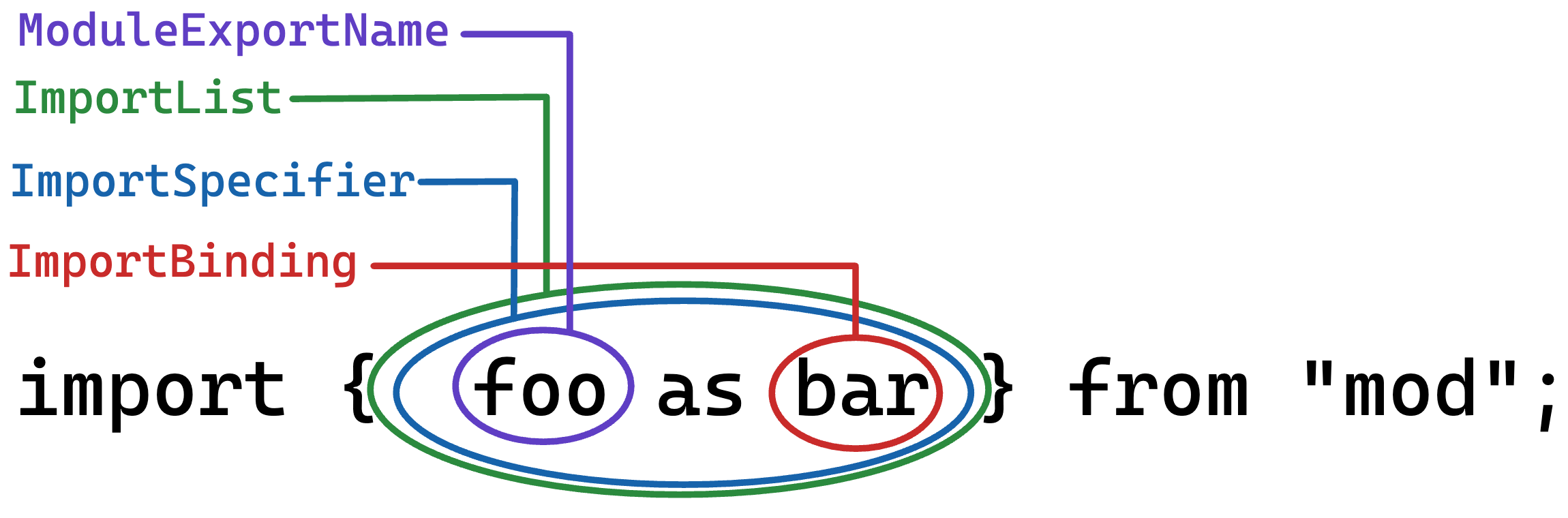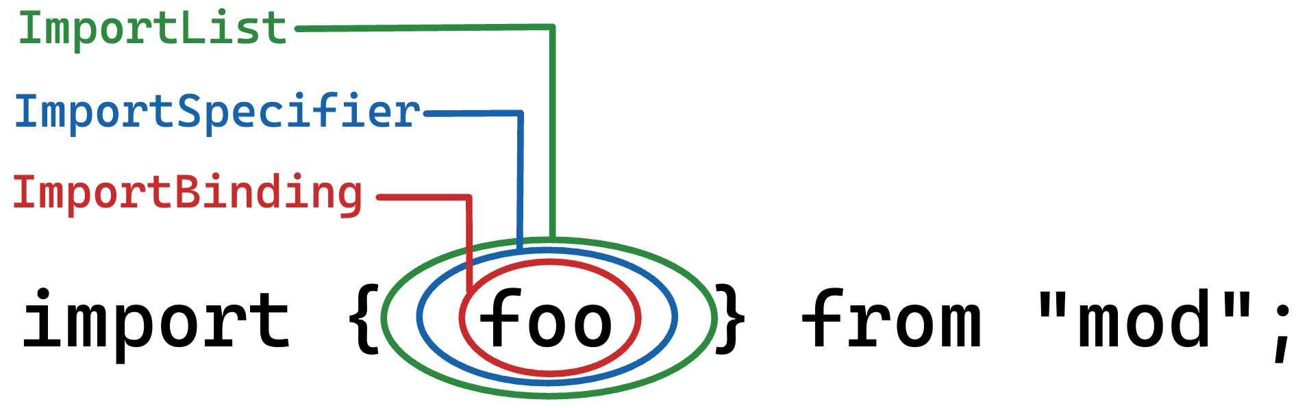 では、ECMAScript の仕様の ImportSpecifier は何を指しているのだろうか。先に答えを言ってしまうと import foo from "bar" における foo の部分である。