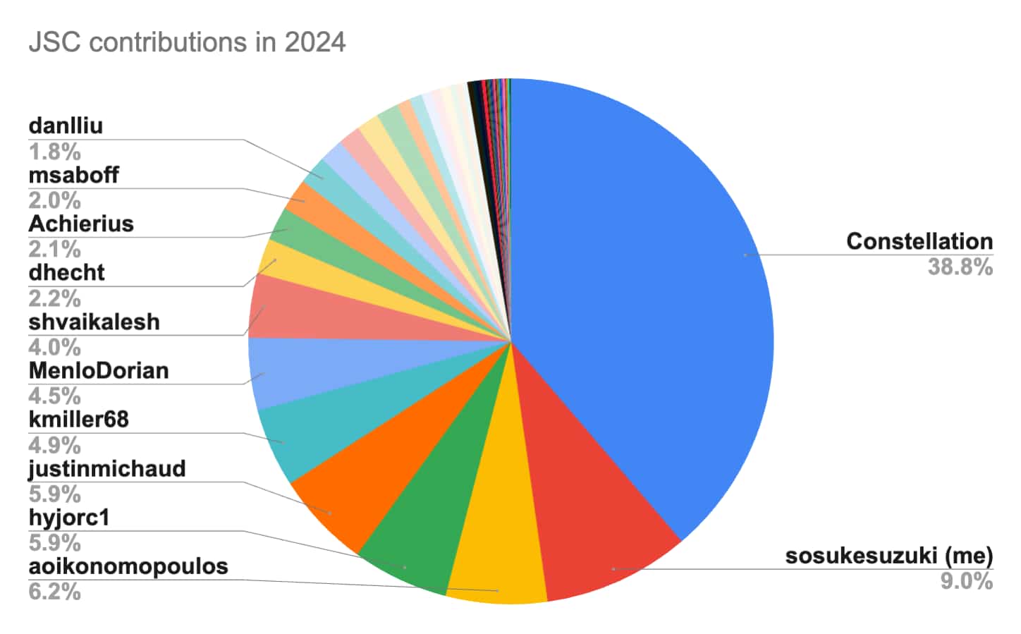 とはいえ、JavaScriptCore に対して1年足らずで 100 個の Pull Request を作成してマージされる、というのはまあまあ珍しいことのようです。実際に、2024 年内にマージされた JavaScriptCore に対する PR の作者を円グラフで表すと、以下のようになっています。